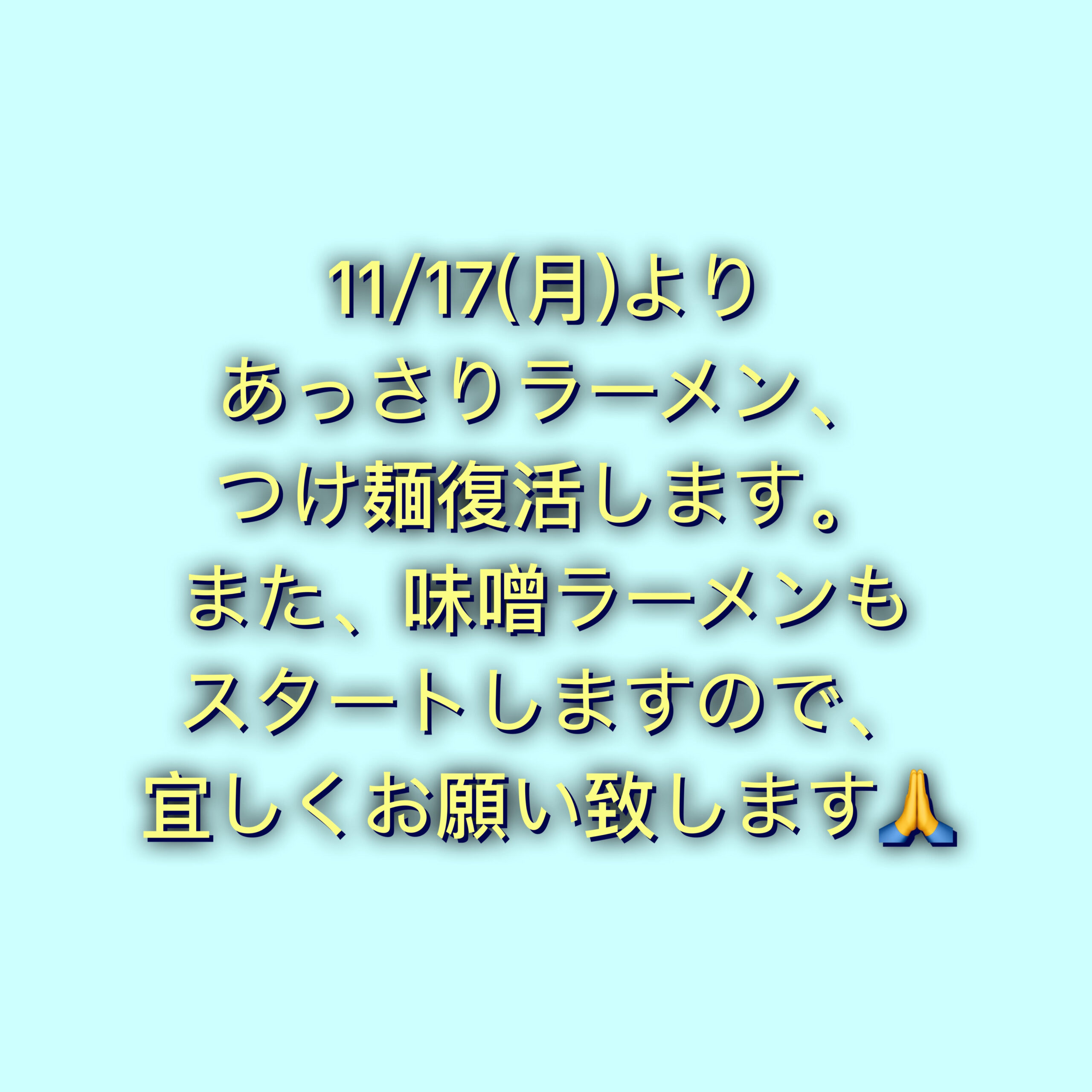 ラーメン燈郎からのお知らせです 2025.11.14 11/17(月)よりラーメン燈郎にて お客様からの要望により あっさりラーメンとつけ麺を復活させていただきます。 あっさりラーメン ミニ¥930 並¥980 中¥1050 大¥1100 あっさりつけ麺 ミニ¥950 並¥1050 中¥1150 大¥1200 また冬季限定での味噌ラーメンも販売開始いたします。 ミニ¥1050 並¥1150 中¥1250 大¥1300 よろしくお願いいたします。