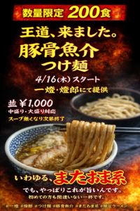 一燈再開と4月の限定のお知らせ 2026.04.11 いつもご利用いただきありがとうございます。 明日4/12(日)より一燈再開いたします。 また、季節感の無い季節の限定、豚骨魚介つけ麺始めます。 一燈&燈郎にて同時開催 4/16(木)スタート 数量限定200食、スープ無くなり次第終了 杯数制限無し、並¥1000、中盛り、大盛りまで対応 大盛りにはお変わりスープ付きです。 今でこそ、少なくなりましたが、またおま系是非ご賞味ください。