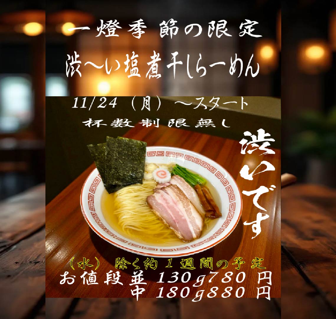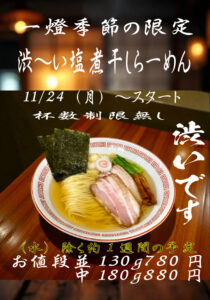一燈11月の限定は、「渋~い塩煮干しらーめん」になります。