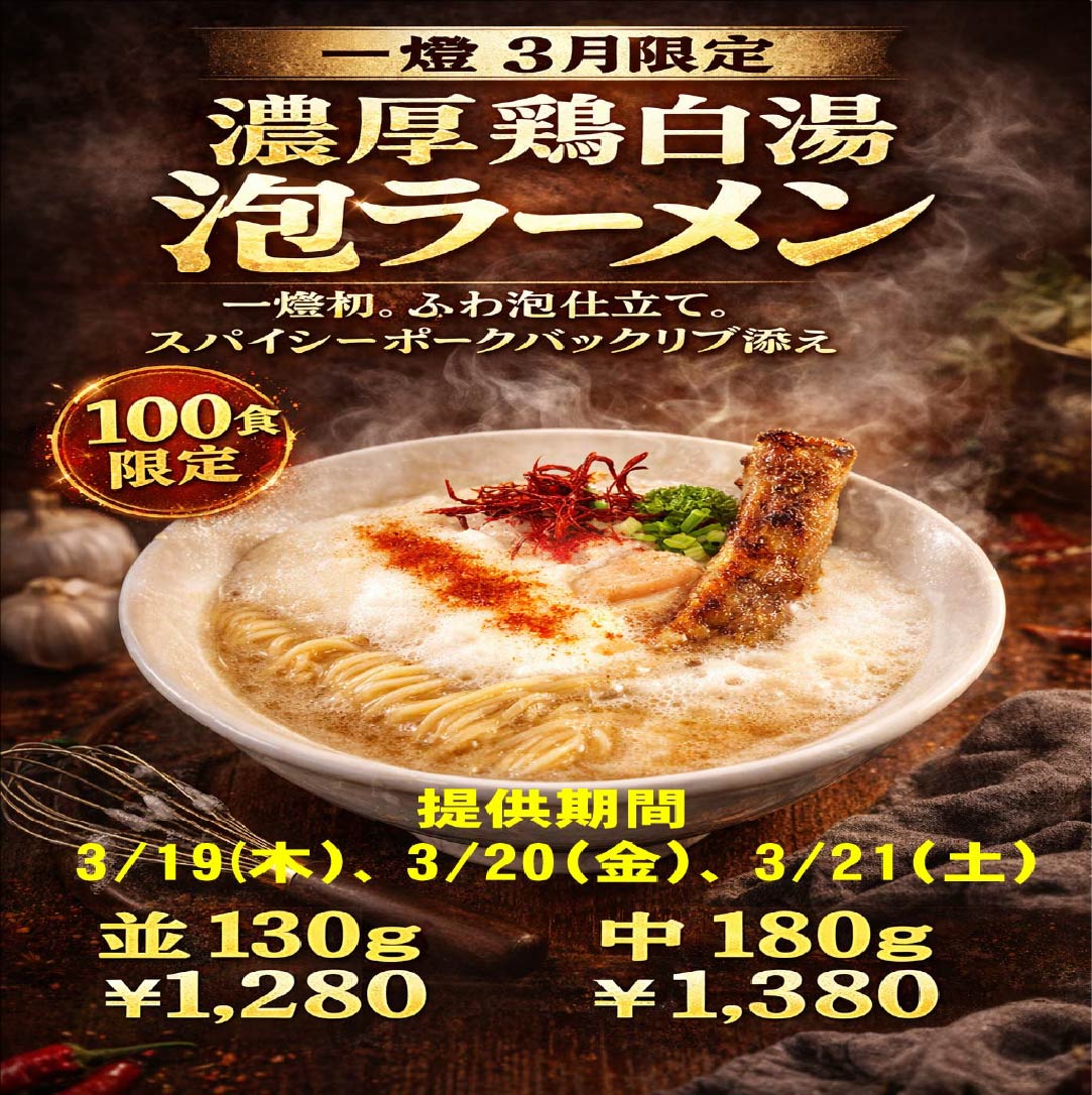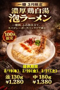 提供期間3/19(木)3/20(金)3/21(土)杯数制限無しですが、おおむね100食を予定しておりますので、どうぞ宜しくお願いしたします。