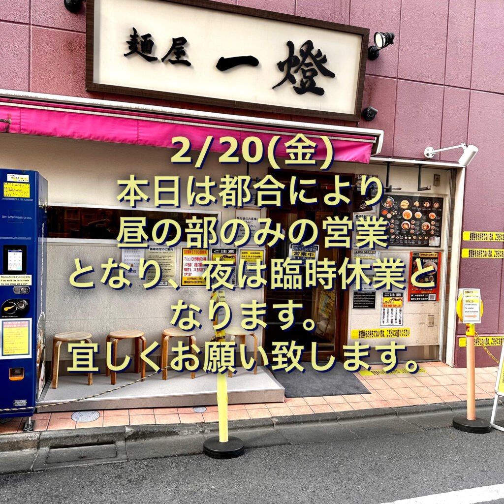 お世話になっております。本日は昼営業のみで、夜は臨時休業となります。ご迷惑をおかけしますが、よろしくお願いいたします。